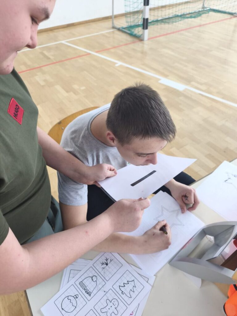 Zrcalno crtanje: učenici su gledajući u ogledalo pokušavali precrtati zvijezdu i dovršiti božićne motive.