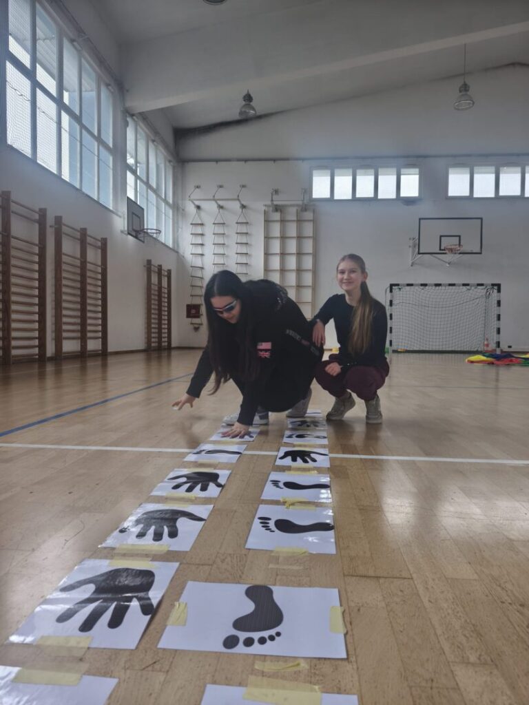 Uz pomoć posebnih naočala koje simuliraju slabovidnost, prolazili su poligon koji je zahtijevao koordinaciju dlanova i stopala na označene otiske.