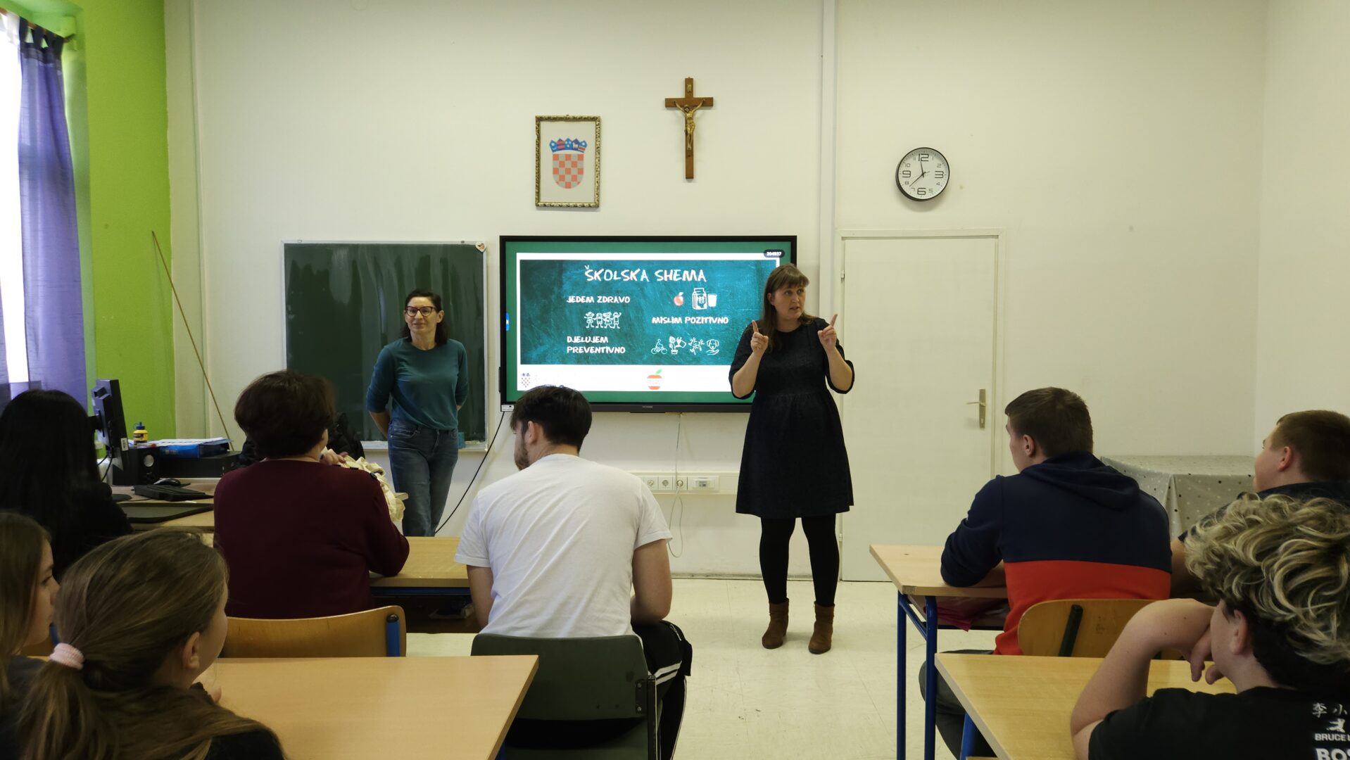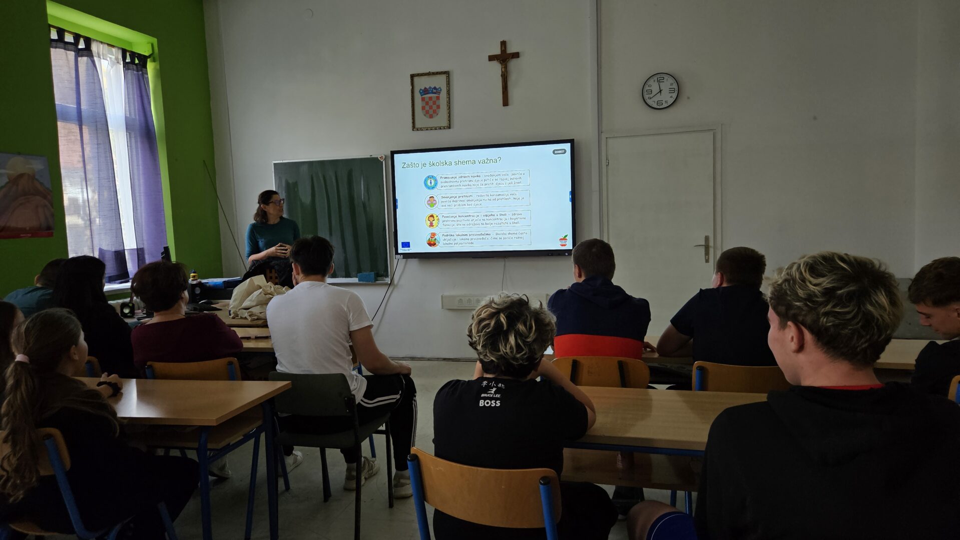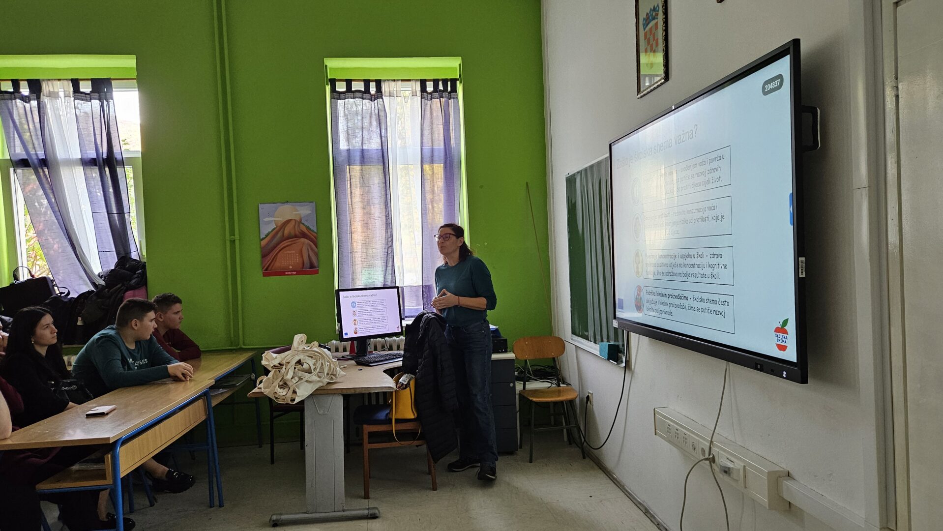 Učenicima je gospođa Dodig objasnila zašto je školska shema važna, što se njome pokušava postići i kako ona može promijeniti njihov odnos prema zdravoj prehrani. Posebno su ih se dojmili i prigodni pokloni u obliku majica, pregača i platnenih torbi koje su pojedinci uspeli osvojiti i prema kojima će pamtiti današnje informativno i interaktivno predavanje.