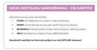 Za učenike od 5. do 8. razreda provedena je radionica „Digitalna samoobrana“, usmjerena na osnaživanje učenika za prepoznavanje manipulativnog dizajna aplikacija i kritičko promišljanje rizičnih online situacija. Učenici su učili prepoznati tamne obrasce dizajna, razumjeti koncept digitalne trajnosti i gubitka kontrole nad podacima, uočiti znakove online vrbovanja te primijeniti protokol postupanja u slučaju online ucjene ili uznemiravanja.
